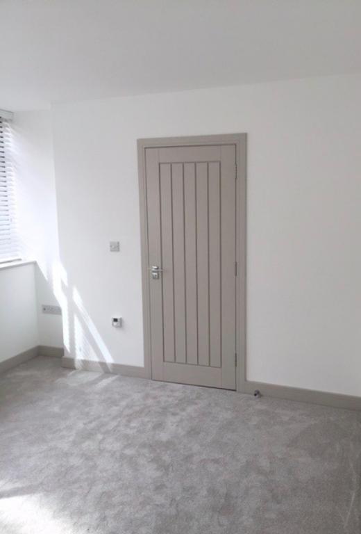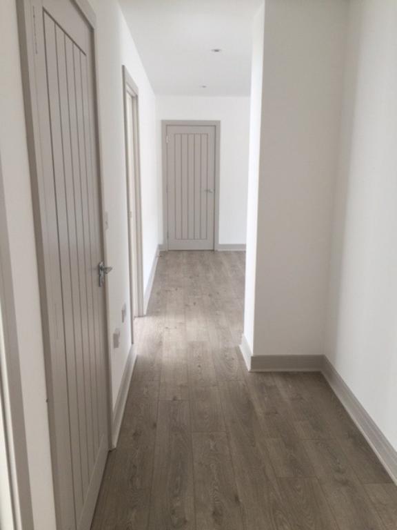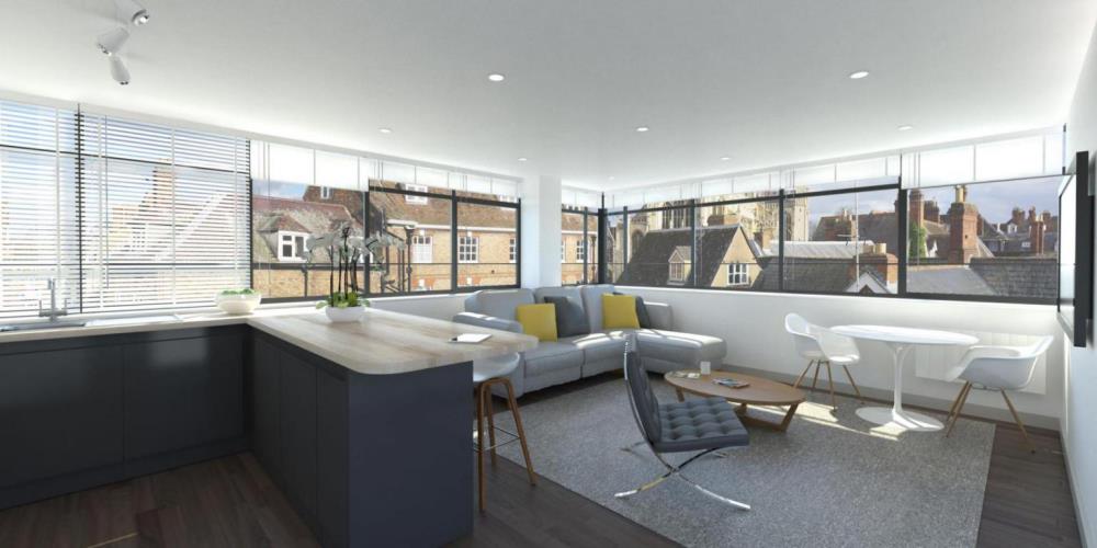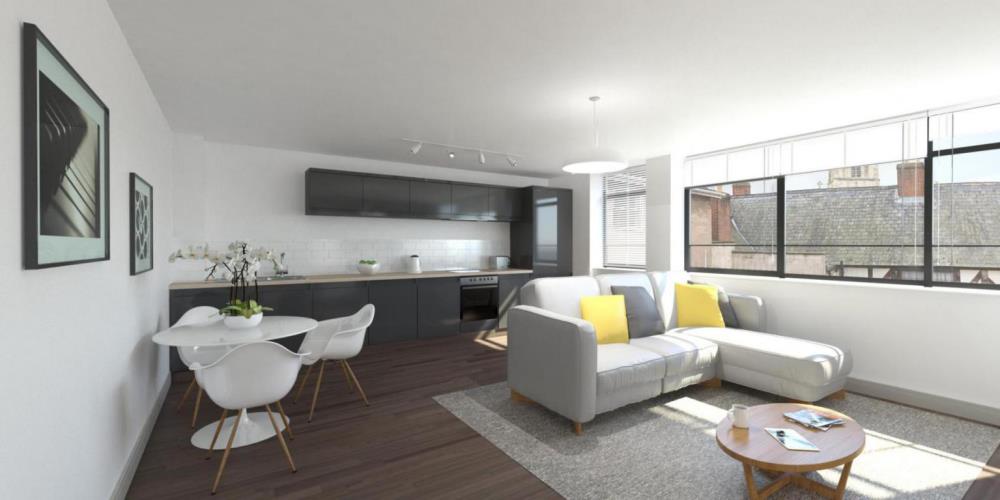 Appointed by the developer, our brief was to incorporate a scheme suitable for starter town apartments as well as two feature units. With wraparound ribbon windows and a red brick façade, inspiration came from industrial open plan loft living. Kitchens were fitted with smart gloss units, bathrooms were kept minimal with sleek white sanitary ware and contrasting grout metro tiles, while bedrooms were given a hint of lux with the addition of a deep pile carpet. The addition of glazing bars to the wrap around windows provided more of a feature to the otherwise large pane windows. Elsewhere, circulation spaces were fitted with concrete effect Amtico floors bringing together a robust but aesthetically appealing look.