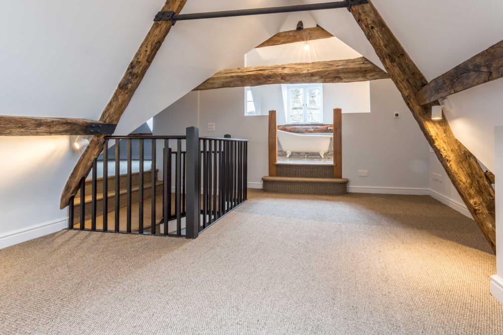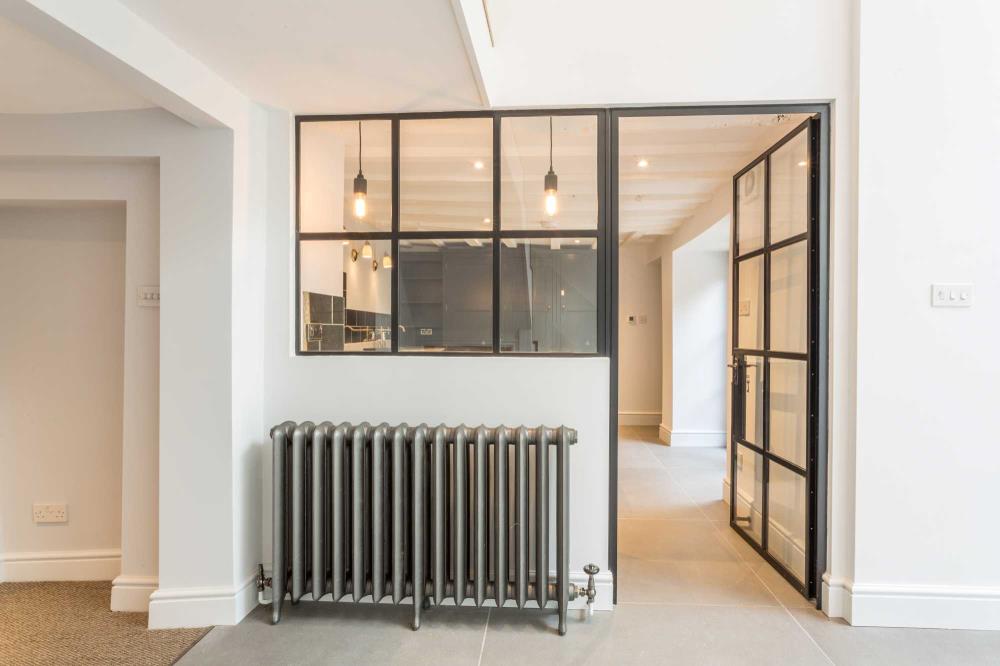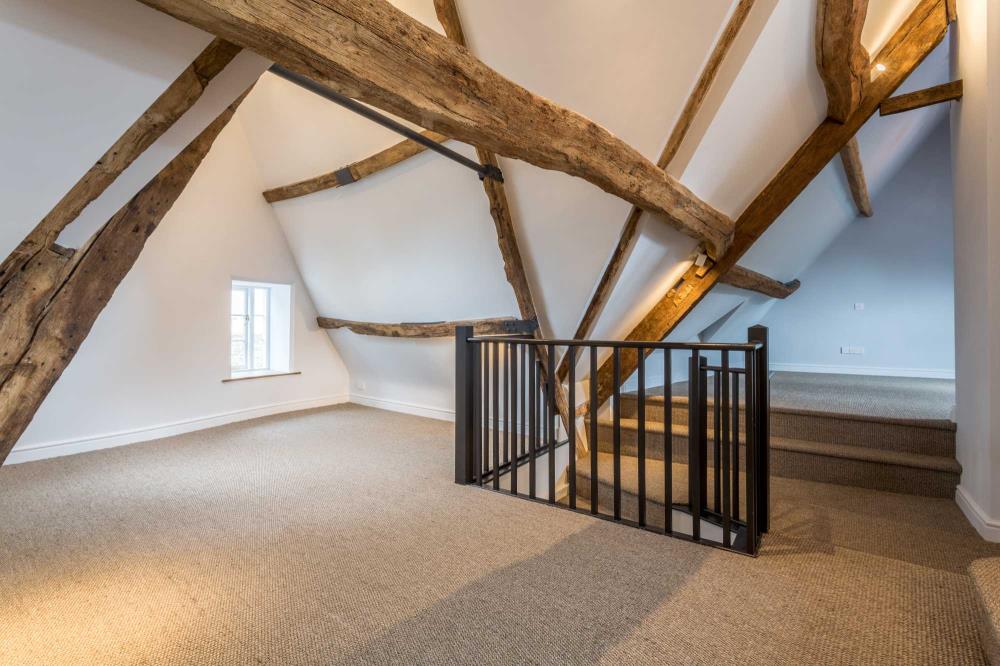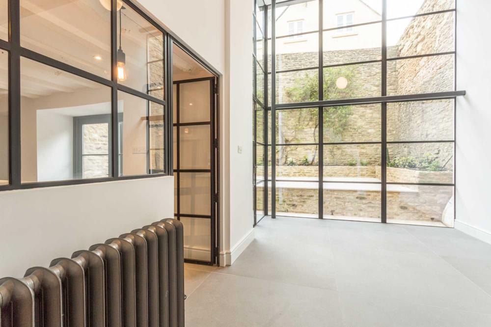 Sitting atop the picturesque Gumstool Hill in the Cotswold town of Tetbury, we were delighted to be part of the restoration team transforming this crumbling Grade II Listed former artist’s studio into a traditional townhouse with a contemporary twist. Replacing a thrown together timber extension to the rear of the house with a contemporary, full height glazed crittall curtain wall created an explosion of light opening into a private stone courtyard. A new oak staircase was designed to sit quietly in the corner of the newly formed dining room, while the small dark kitchen was transformed by the installation of a second glazed internal crittall door and screen allowing a seamless through-flow into the dining room. The careful adjustment of floors between the first and second floor created the most spectacular master bedroom suite in which the ancient historic timber beams have become an outstanding feature.
